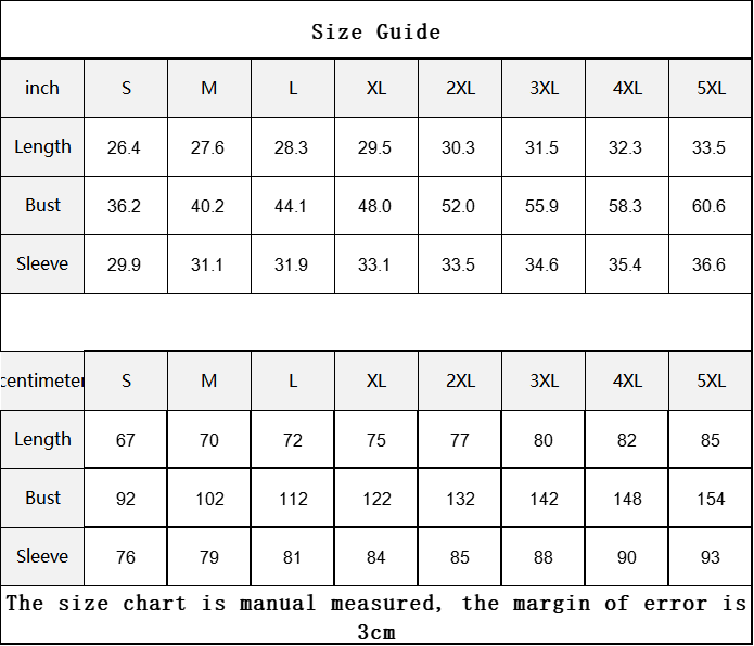 The size chart is manual measured, the margin of error is 3cm