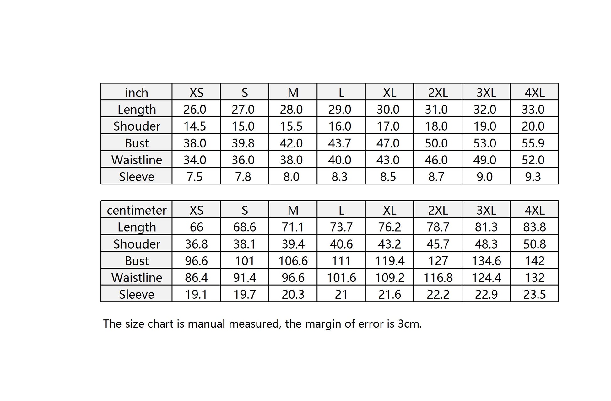 The size chart is manual measured, the margin of error is 3cm